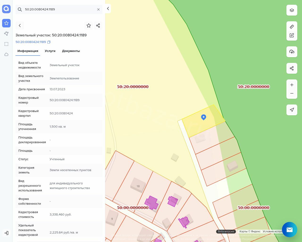 Площадь земельного участка: 1500 м^2 Кадастровый номер земельного участка: 50:20:0080424:1189 Вид разрешённого использования земельного участка: Для индивидуального жилищного строительства