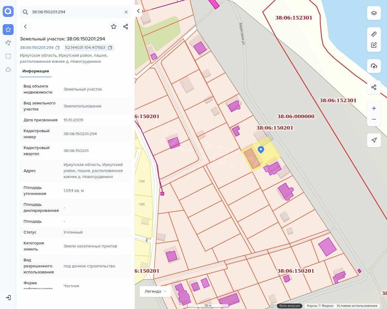 Земельный участок, кадастровый номер 38:06:150201:294, площадью 1054 +/- 23 кв.м., категория земель: земли населенных пунктов, виды разрешенного использования: под дачное строительство Адрес: местоположение установлено относительно ориентира, расположенного в границах участка. Почтовый адрес ориентира: Иркутская область, Иркутский район, пашня, расположенная южнее д. Новогрудинина